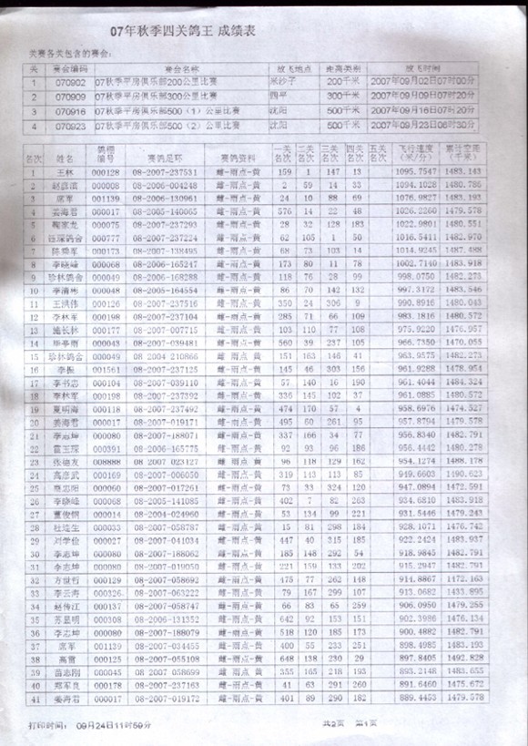 哈市平房俱乐部秋季4关鸽王成绩