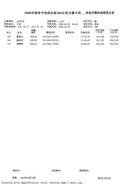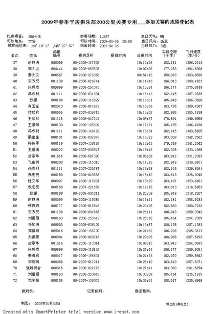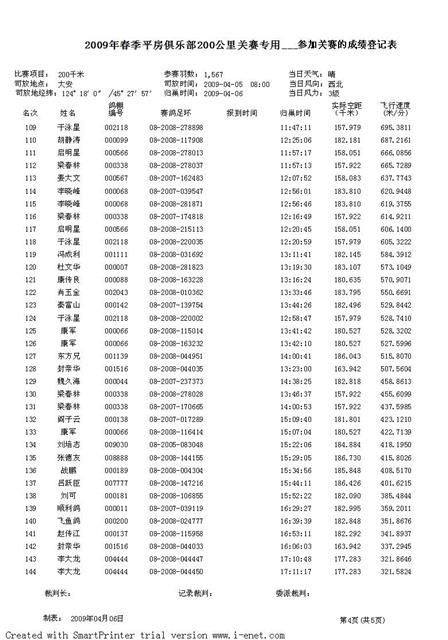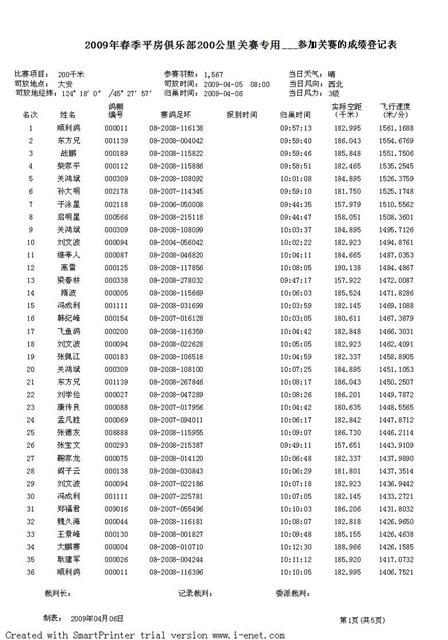 平房赛鸽俱乐部2009年春季六关鸽王挑战赛成绩