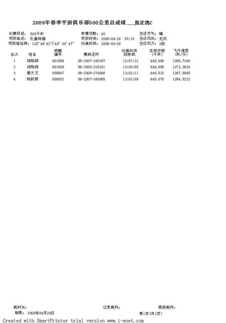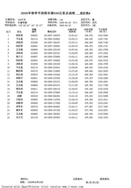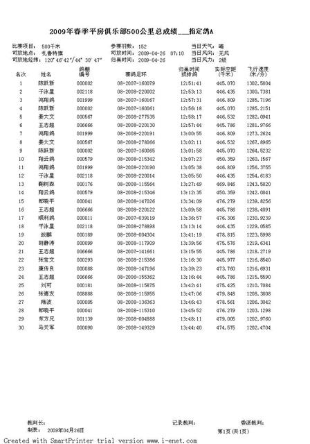 2009年春季平房俱乐部500公里指定鸽成绩