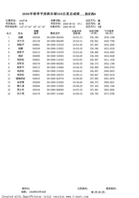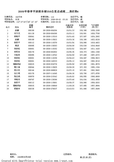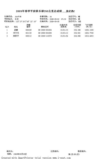 2009年平房赛鸽俱乐部春季350公里指定鸽成绩