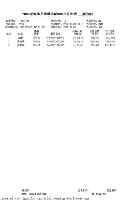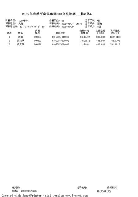 2009年春季平房赛鸽俱乐部800公里指定鸽成绩