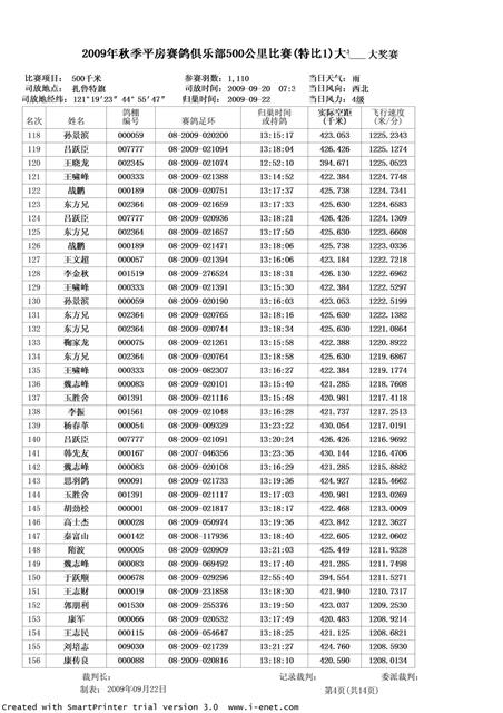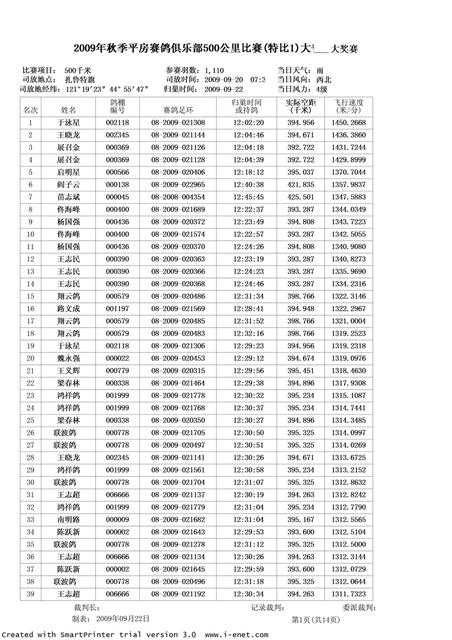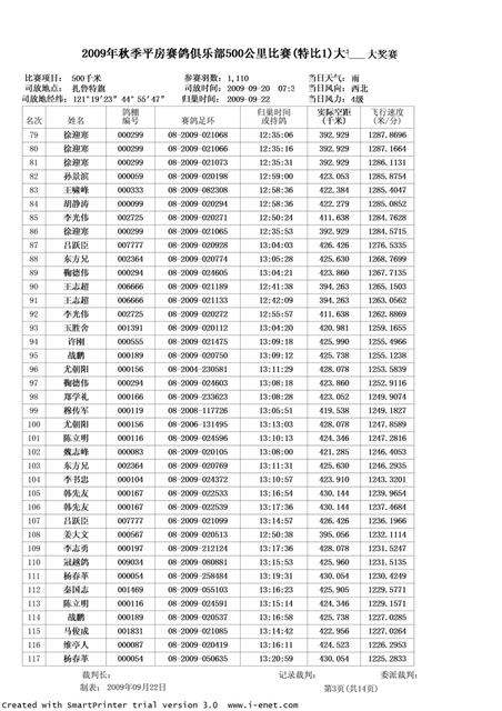 哈尔滨平房赛鸽俱乐部2009年秋季500公里大奖赛成绩
