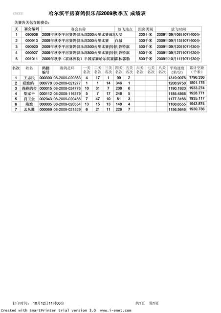 哈尔滨精英信鸽2009年度秋季五关鸽王成绩(大坑预稿)