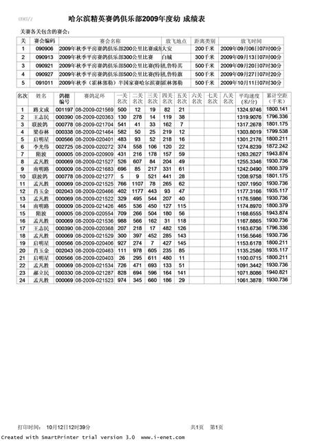 哈尔滨精英赛鸽俱乐部2009年度幼鸽鸽王鸽王成绩(预稿)