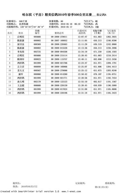 哈尔滨(平房)精英信鸽2010年春季500公里比赛指定鸽A组成绩预稿