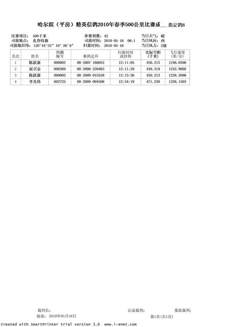 哈尔滨(平房)精英信鸽2010年春季500公里比赛指定鸽B组成绩预稿