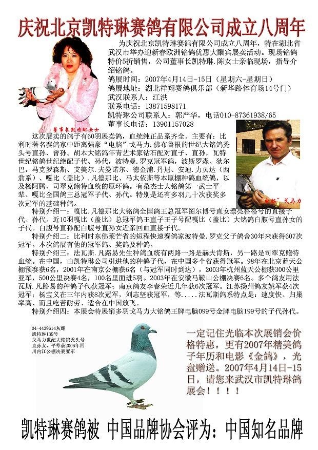 凯特林赛鸽有限公司武汉鸽展会 刚刚由重庆江北区信鸽协会举办的北京 凯特林赛鸽有限公司,重庆江北区鸽展后。将于2007年4月14日前后到武汉举办鸽展会。