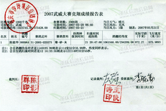 重庆沙坪坝区威武1000公里归巢成绩快报