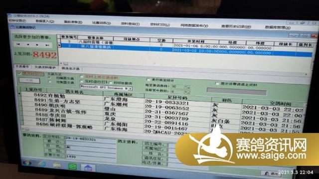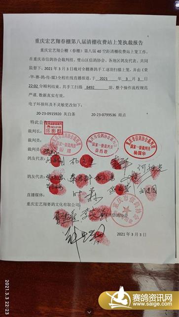 重庆宏艺翔信鸽公棚(春棚)2021年第八届40空距清棚收费站上笼工作,在重庆市信鸽协会裁判组、璧山区信鸽协会、各地区鸽友代表、共同监督下,2021年3月3日下午对全棚赛鸽手工逐羽扫描上笼,并由《荣-华-传-媒》全程在线直播报道,于2021年3月3日22:02分顺利结束。共手工扫描8492羽。整个操作流程规范严谨,数据真实有效。