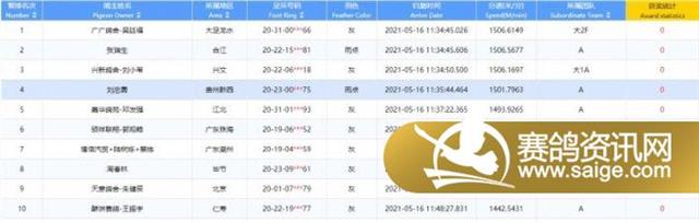 5月16日11:34,广广鸽舍-吴廷福的一羽赛鸽以1506.6149米/分的速度率先归巢,获得冠军;张瑞生的一羽赛鸽以1506.5677米/分的速度紧随其后,获得亚军;兴新鸽舍-刘小苇的一羽赛鸽以1506.1697米/分的速度获得季军;刘忠勇的一羽赛鸽以1501.7963米/分的速度获得季军。第五至第十名分别归属于:嘉华鸽苑-邓发强、硕祥联翔-郭观略、博信汽贸+陆树烁+蔡炼、周春林、天意鸽舍-朱建辰、酥饼赛鸽-王振宇。