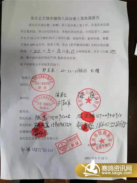 重庆宏艺翔(春棚)第八届三关赛自2021年4月28日开始,热身赛和预赛成功举行,第一关热身赛集鸽5380羽,归巢4696羽,归巢率87.29%。第二关预赛集鸽4681羽,归巢2945羽,归巢率62.91%。