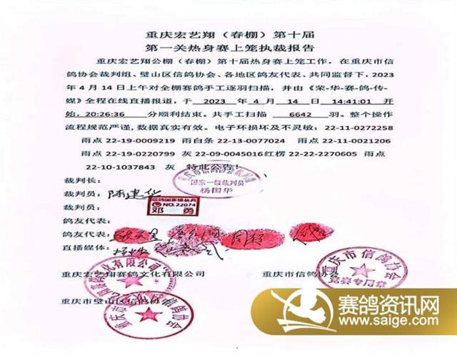 重庆宏艺翔信鸽(春棚)2023年第十届第一关(热身赛)于2023年4月14日在重庆市信鸽协会委派的裁判组、壁山区信鸽协会及鸽友代表,直播媒体的共同监督见证下正式开启。共计集鸽6642羽。