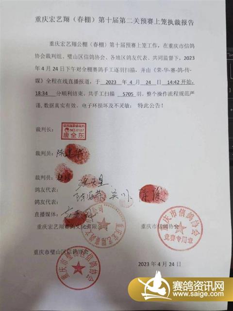 重庆宏艺翔公棚(春棚)第十届第二关预赛上笼工作,在重庆市信鸽协会裁判组、壁山区信鸽协会、各地区鸽友代表、共同监督下,2023年4月24日对全棚赛鸽手工逐羽扫描,并由《荣﹣华﹣赛﹣鸽﹣传﹣媒》全程在线直播报道,于2023年4月24日14:42开始,18:34分顺利结束。共手工扫描5705羽。整个操作"流程规范严谨,数据真实有效。 裁判长:唐全东 裁判员:陈建华,袁忠明 鸽友代表:陈俊,张天星,吴川等 直播媒体:信-鸽-天-堂-网 以下是图片消息: