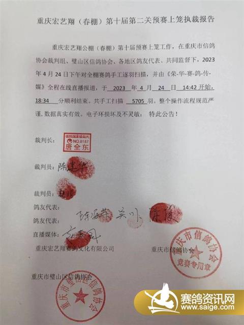 重庆宏艺翔公棚(春棚)第十届第二关预赛上笼工作,在重庆市信鸽协会裁判组、壁山区信鸽协会、各地区鸽友代表、共同监督下,2023年4月24日对全棚赛鸽逐羽扫描,并由《荣﹣华﹣赛﹣鸽﹣传﹣媒》全程在线直播报道,于2023年4月24日14:42开始,18:34分顺利结束。共手工扫描5705羽。整个操作"流程规范严谨,数据真实有效。
