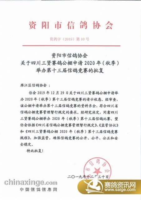 资阳市信鸽协会关于四川三贤赛鸽公棚申请2020年(秋季)举办第十三届信鸽竞赛的批复