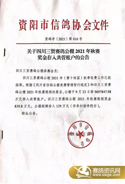 三贤公棚已按规程将参赛费转入市鸽协共管账户。