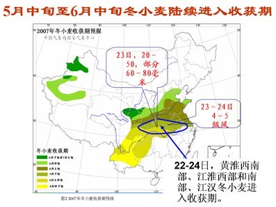 预计5月22-25日,黄淮西南部、江淮西部和南部、江汉冬小麦将进入收获期,23日前后,上述地区将有中到大雨,局地暴雨并有短时雷雨大风,对冬麦区小麦的收晒会带来不利影响。