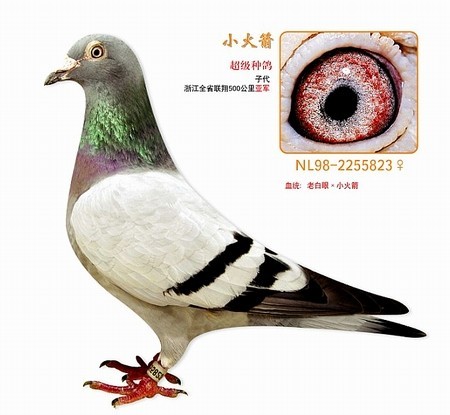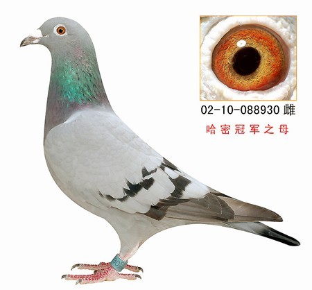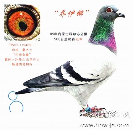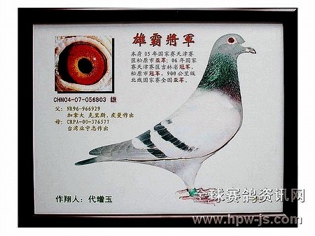 2006-06-002866雨白条黄眼雌的父鸽,台鸽02-619054雨花沙雄获台湾六关比赛冠军,血统是杨阿腾