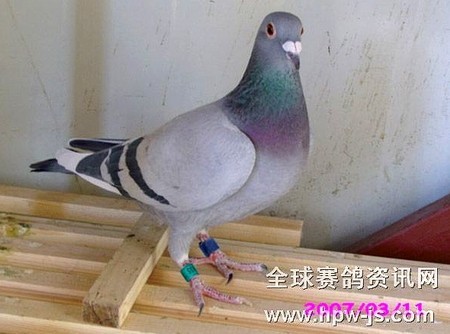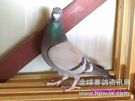 NL96-1732069灰黄雄,康普休斯詹森系,詹姆士帮德007及神奇05曾孙。此鸽外孙:05-05-221811灰雌,获05年国幼鸽赛内蒙赛区11名(7300羽),名人名鸽大奖赛季军,指定鸽季军。