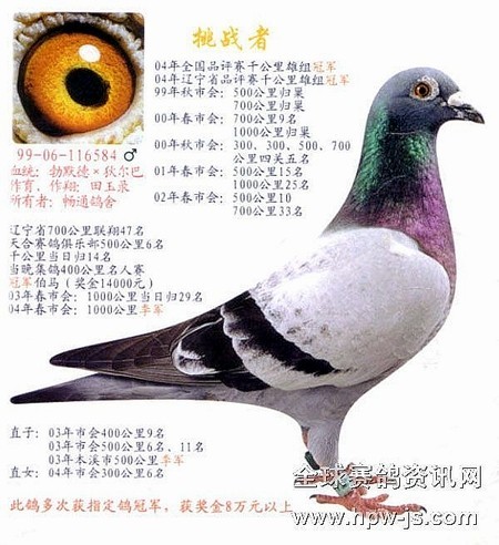 2006-06-002866雨白条黄眼雌,获2006年秋沈阳市职工鸽会大奖赛冠军,指定鸽冠军,普赛冠军,赛区冠军。