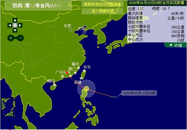 2008年8月20日,据中央气象台预报,台风“鹦鹉”于昨日17时位于我国台湾省恒春市东南方大约620公里的洋面,中心附近最大风力有13级,将以每小时20公里左右的速度向西偏北方向移动,强度继续加强,移入南海,并逐渐向粤东沿海靠近,将对广东产生严重影响,有可能成为广东今年以来最强台风。