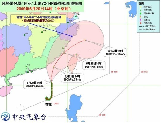 中国气象局副局长矫梅燕二十日上午九时宣布启动气象灾害应急预案Ⅲ级应急响应命令。中央气象台预报指,今年第三号热带风暴“莲花”的中心今天上午十时位于东沙岛东偏南方大约六十公里的南海北部海面上,中心附近最大风力有九级,达每秒二十三米。预计,“莲花”将以每小时十公里左右的速度向偏北方向移动,逐渐向福建南部到广东东部沿海靠近,并有可能于明天中午到夜间在这一带沿海登陆,强度缓慢减弱。由于“莲花”云系覆盖范围广,影响区域大,沿海地区将有大到暴雨,部分地区将有大暴雨。据中央气象台预报,受“莲花”影响,今明两天,南海中北部海面、巴士海峡、巴林塘海峡、台湾海峡、广东东部沿海、福建中南部沿海、台湾南部沿海将有六至八级大风,风暴中心经过的附近海面有九级大风、阵风可达十至十一级;台湾南部将有大到暴雨、局地有大暴雨;广东东部和福建东部的部分地区将有中到大雨。