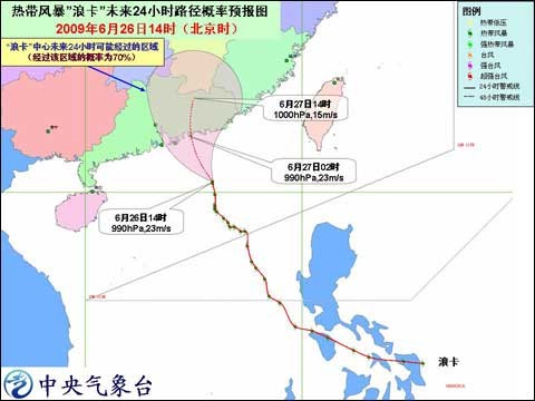受“浪卡”和西南季风的共同影响,今天中午到明天中午,南海中北部海面、广东沿海将有7-9级大风,风暴中心经过的部分海域或地区的阵风可达10级,福建南部沿海、南海南部海面将有6-7级大风;广东中东部、福建南部将有大到暴雨,部分地区有大暴雨。