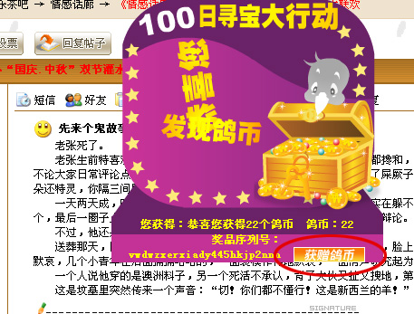 活动规则: 奖品有可能藏在站内某篇文章、图片,论坛某个主题贴,甚至还有可能藏在商城的某件商品里!只要你随机的点击,说不定奖品就会属于你。当你获得奖品的同时,作为发布者,同样也有一份小小的奖品。