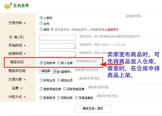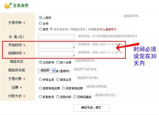 1、 会员发布商品的开始时间和结束时间间隔必须在30天内,到结束时间后商品自动下架。