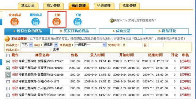 2、 到期商品如果需要重新上架,卖家通过选择已下架的商品,点击上架,则商品重新上架,发布时间自动延长30天。