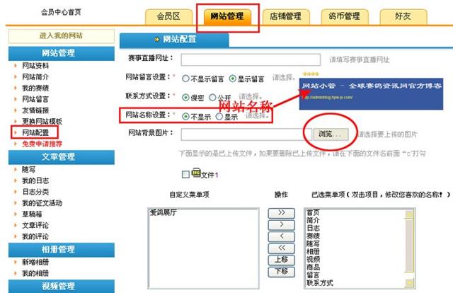 积分达到六级的会员,可登录会员中心,选择“网站管理”——“网站配置”,自定义个人网站背景图