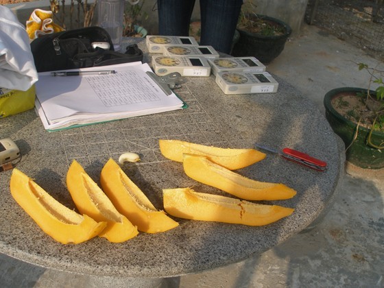 10月29日今年秋天的重头戏终于来临,东莞市信鸽会500公里放江西吉水的比赛,在早上七点零五分开笼。预计要下午一点多才有鸽子到,上午回到公司先把手上的工作清理完。十二点就上鸽棚开始等鸽子,因为今天的天气非常不错,而且看了卫星气象图片,赛线上的天气也很好,怕有什么奇迹的出现,连中午饭都不敢下去食堂去吃,叫同事打饭上来边吃边等。之前几场比赛我都没有认真等过鸽子,第一几位师傅都在,我也帮不上什么忙。第二自己的事也多,不能整天在鸽棚。第三身体不好血压高,受不了那种刺激。 把鸽钟全部检查好,包括换上新的电池,注意这电池一定要有保障,以防万一没电。另外鸽钟不能放在阳光下晒的时间太长,会突然不走和发生意想不到的故障。冲上一壳好茶,一边品茶一边和文师傅聊鸽子,昨天早上交鸽子前对四十四羽上战场的鸽子全都做过评估,除了大羽换条不理想外,基本上都是自己认为满意的。看看旁边的木瓜树上,一个木瓜熟透了,我们又多了一个饭后果,百分之百绿色食物,鸽粪做肥料的,这也是养鸽子的另一个乐趣。 一点多豪师傅赶到了,接着收到健师傅的电话,东莞市有鸽子到了,大家精神一震,三个人六只眼,开始在天空中徘徊,突然从北面的大山上一个小黑点插了过来,第一羽鸽子终于到了,而且回来的路线是从山上过来的,打破了我鸽子不会爬山归来的观念,粗略估计比东莞慢了半小时,但我这也远三十多公里,这次应该有的计算一下了。打完鸽钟一看鸽子是豪师傅金忠杯三关赛的鸽子。接下来半小时后才有第二羽鸽子到,也是豪师傅三关赛的,这次是按正常的路线绕过山回来了。 整整一个下午到了天黑只回来十八羽鸽子,失望是非常的大,但这条赛线就是这样残酷。今天也深深体会到为什么赛鸽是一种体育运动,昨天早上交鸽子跑了一大圈,排了半天队,今天在鸽棚蹦蹦跳跳了半天等鸽子,晚上又要带着鸽子跑去鸽会验鸽,再排两个多小时的队,鸽子和人都累的半死,你说这能不叫做运动吗!还好今天又回来了十四羽,下个月700公里还有兵力去战斗。