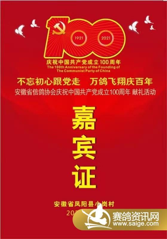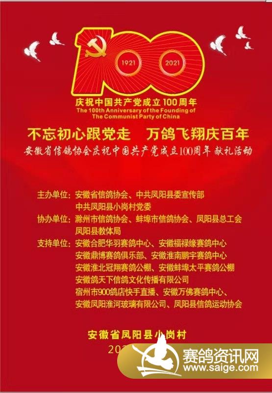 为庆祝中国共产党诞辰100周年,由安徽省主办,蚌埠市信鸽协会、滁州市信鸽协会协办的彩鸽放飞活动将于2021年7月1日上午7点在凤阳县小岗村举行。有意参与本次活动的蚌埠鸽友请于6月30日下午3点半至5点在鸽市集鸽。