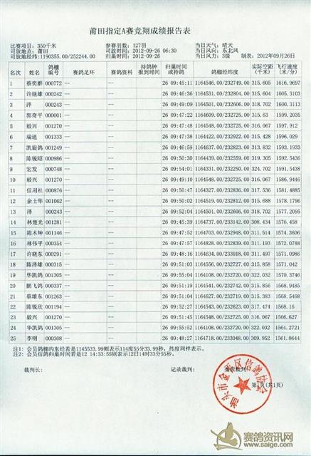 汕头市金平区信鸽协会2012年秋季汽车大奖赛莆田站成绩