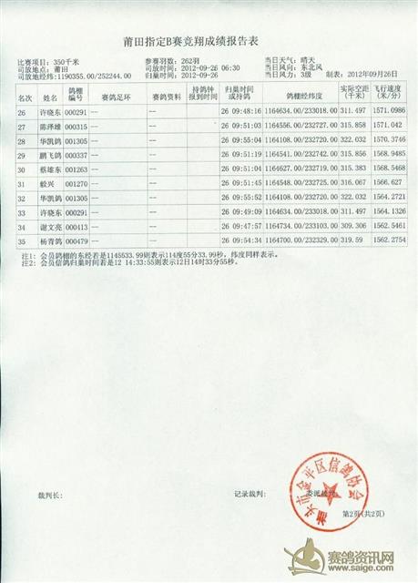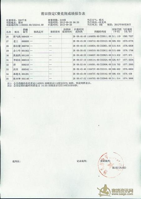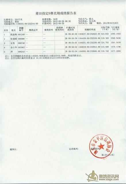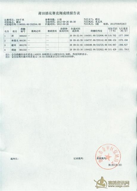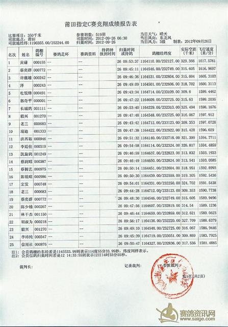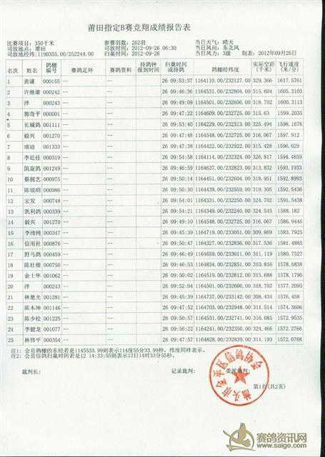 成绩已公布,三天内如无异议漳州站集 鸽时颁发奖金。