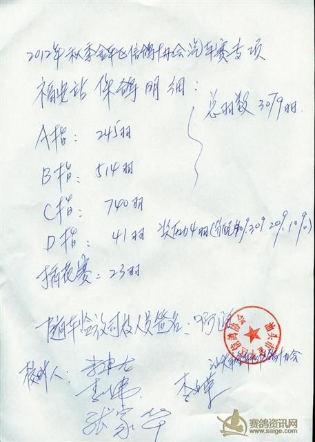 汕头市金平区信鸽协会2012年秋季汽车大奖赛福安站明细表