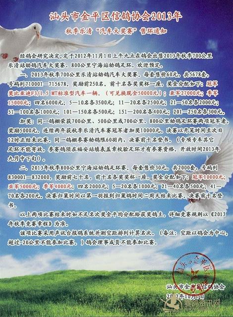 汕头市金平区信鸽协会2013年秋季汽车大奖赛售环通知