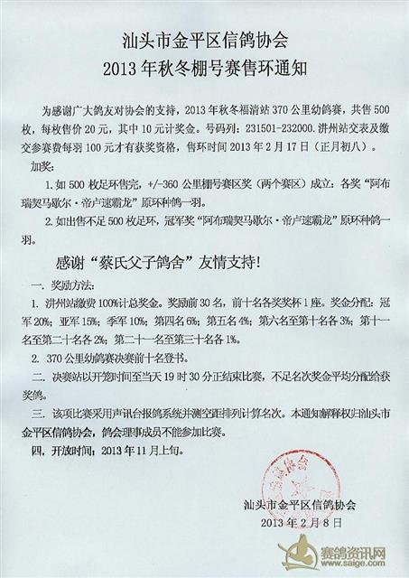 汕头市金平区信鸽协会2013年秋冬棚号赛售环通知