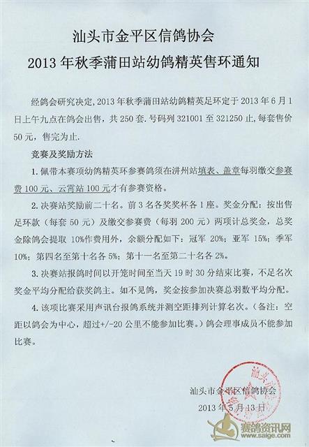 汕头市金平区信鸽协会2013年秋季350公里精英赛售环通知