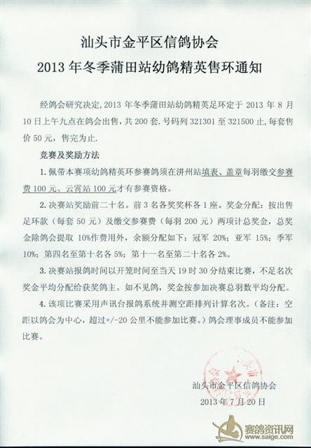 汕头市金平区信鸽协会2013年冬季350精英赛售环通知