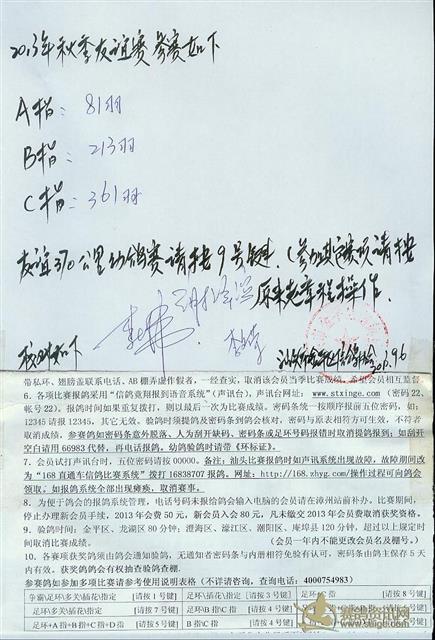 汕头市金平区信鸽协会福清友谊赛明细表