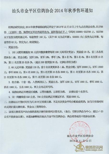 汕头市金平区信鸽协会2014年秋季550公里福鼎幼鸽足环赛售环通知