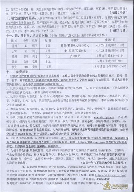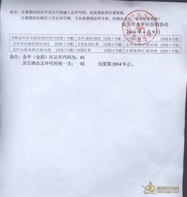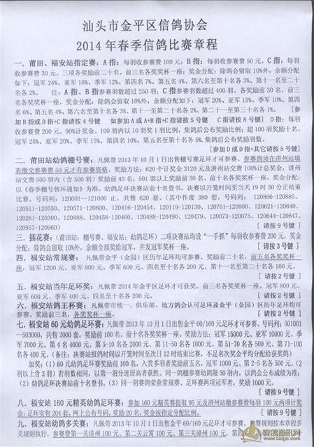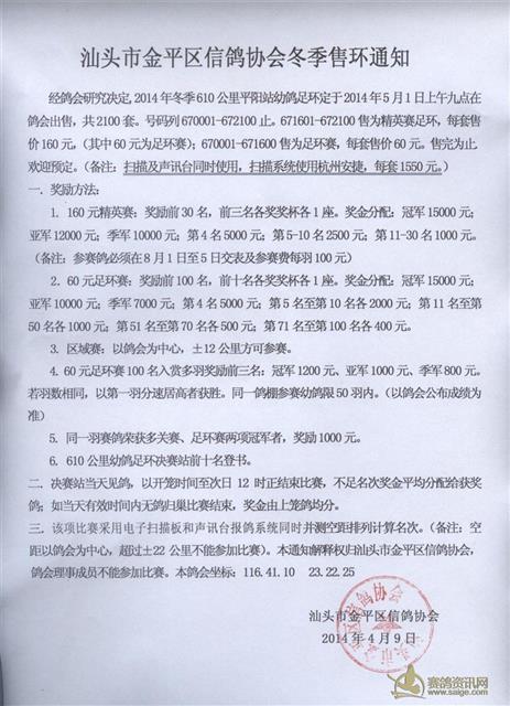 汕头市金平区信鸽协会2014年春季比赛章程及2014年冬季售环通知