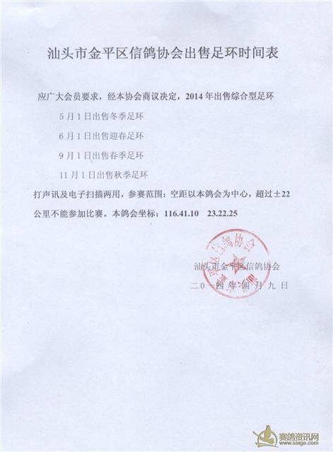 汕头市金平区信鸽协会出售2014年度足环时间表(最新修改)
