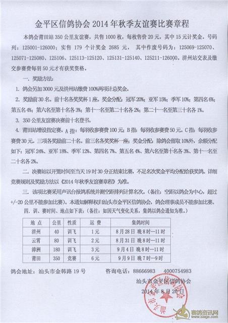 汕头市金平区信鸽协会2014年秋季友谊赛比赛章程