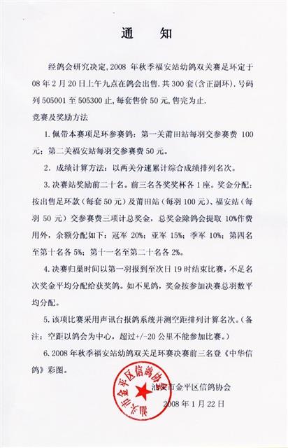 汕头市金平区信鸽协会2008年秋季福安站幼鸽双关赛足环售环通知