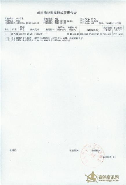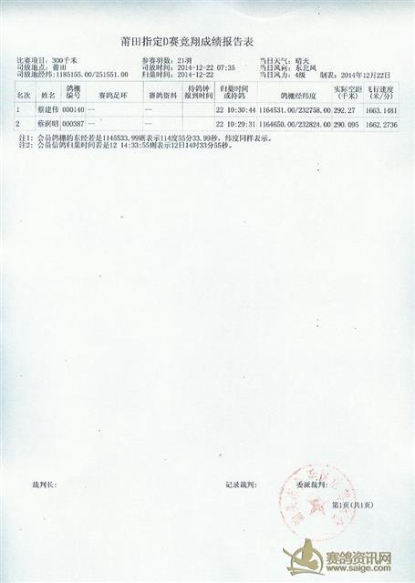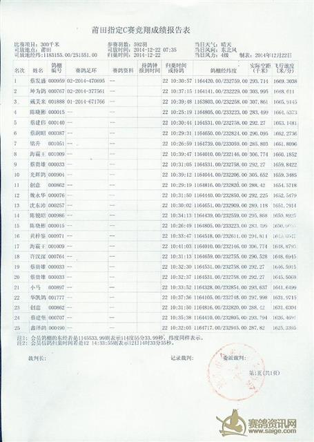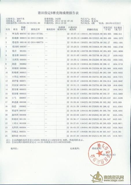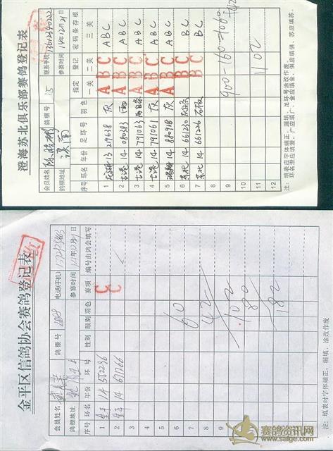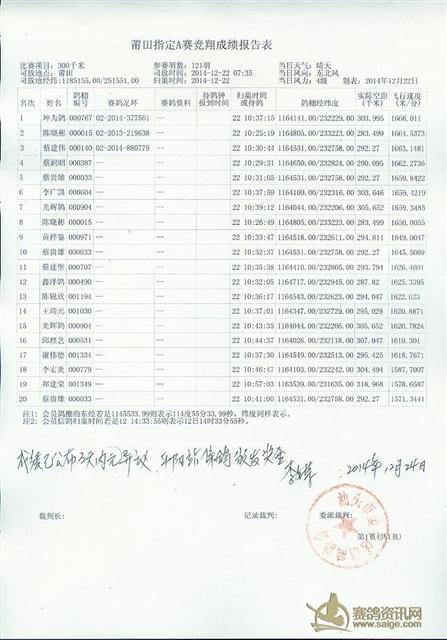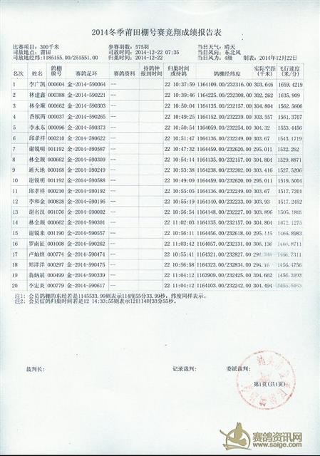 2014年汕头市金平区信鸽协会2014年冬季莆田站成绩
