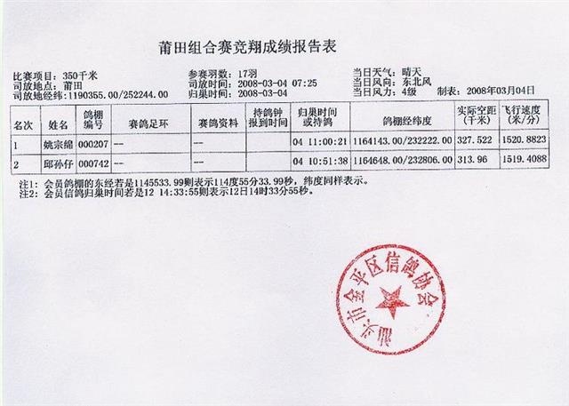成绩3天内无异议,3月10日下午福安站集鸽颁发奖金.
