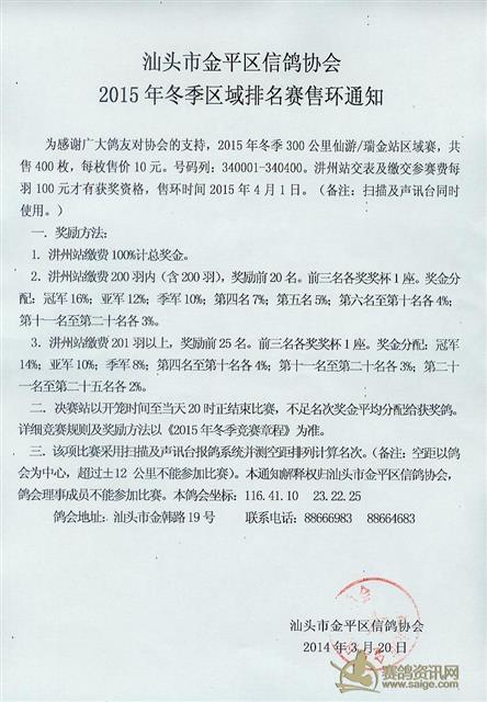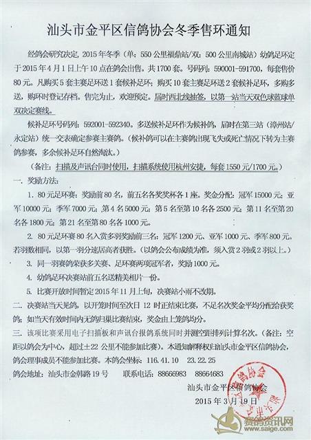 2015年汕头市金平区信鸽协会冬季售环通知(抽签)