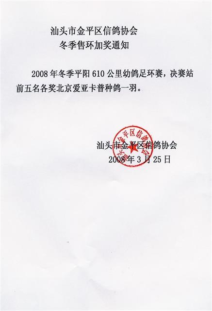 汕头市金平区信鸽协会08年冬季售环加奖通知
